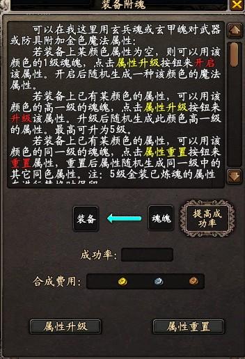 放上你的5级魂魄和装备,点属性升级就可以了,得到的属性还是随机的。4级升5%几率为100%,金装称谓就变成无双XX(比如无双至尊,无双连珠啥的),另外还有附加属性,防具加体质和伤强还有隐藏的防御,物理系的武器加攻击和伤强,法系武器的加法功和伤强,下限和上限没研究是多少,如图:
