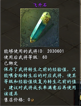 飞升石的作用:是用来恢复武将等级的,将武将恢复到转生前金卡或白金武将的等级