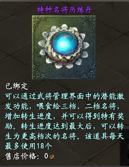 关于三档转二档,二档转一档在喂食名将历练丹的话,每天是有一定的次数限制,只能喂食6个名将历练丹 但是也可以通过商城积分道具的无双宝藏袋,有一定几率开出特种名将历练丹 特种名将历练丹可用来给三档和二档武将喂食 三档武将每天最多可喂食18个,每次增加5点转生进度,在加上每天