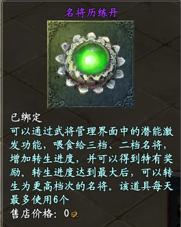 三档名将转二档名将,通过购买积分道具,名将历练惊喜袋 打开后会获得1个名将历练丹和2个松烟墨 转二档直接使用喂食名将历练丹即可 三档武将转二档武将的话是需要1510的转生进度 喂食一个名将历练丹可以增加5点,每天可喂食6次 给三档名将喂食"名将历练丹&qu