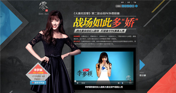 2014年《大唐无双零》PK赛真人秀的筹备活动已进入紧张的第二阶段,游戏内每个大区的强队们正在积极备战角逐八强。同样紧张的是我们为战队邀请的四大女神经纪人。目前,所有场内和场外的玩家,正在为风格各异的女神经纪人积极的点赞和投票。最终票数将决定玩家朋友们所获得的福利大奖,并确定各四强战队的经纪人选。娱乐经纪人各具风姿,代表了不同维度的奖品和福利。她们分别是:优雅经纪人沈梦辰、甜萌小公主李梦颖、性感火辣的装女郎以及美女主播曹安娜。