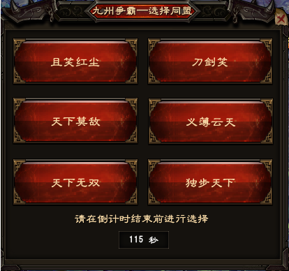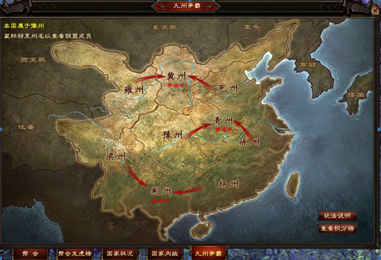 了解了建立联盟的前提以后,轻雨再为大家引入一个名词“中军国”。所谓“中军国”,类似于我们平时所说的联盟老大。联盟共6个,当服务器处于“九州争霸周”时,周二晚上9点,服务器会自动设定上一次“九州争霸周”中排名前5的联盟的“中军国”为本周的“中军国”,再从上次排名第一的联盟中选择除该联盟中军国以外,国力排名第一的服务器作为第6个中军国。这样,联盟的6个“首领”就诞生了。