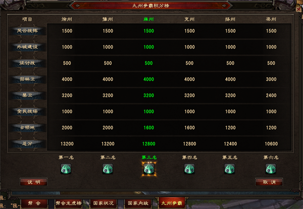 1.联盟和国家的诸多国战行为都将影响联盟排行榜的分数,具体规则详见排行榜中的说明。